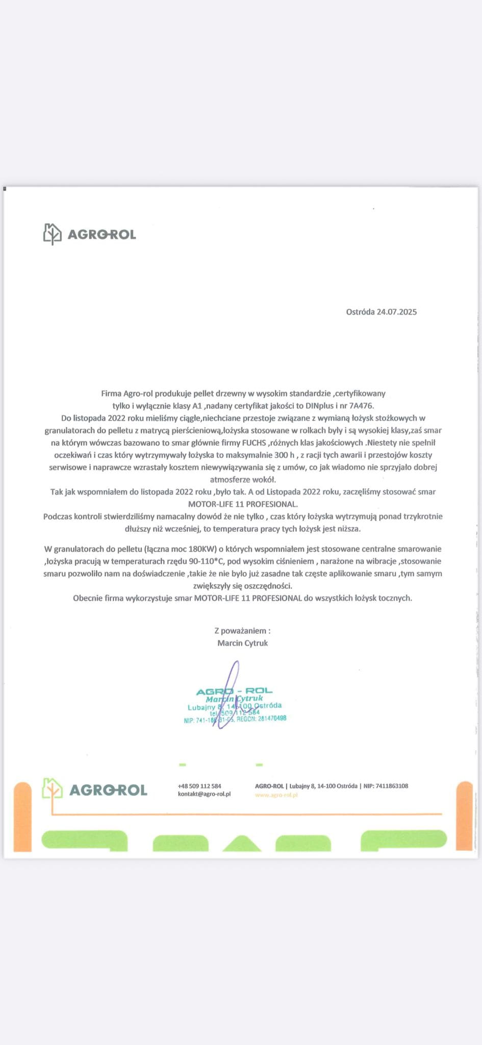 Łożyska zaaplikowane smarem motor-life 11 professional pracują conajmniej 100% dłużej niż przy innych używanych smarach dostępnych na rynku - sprawdzone przez firmy produkujące pelet !!!